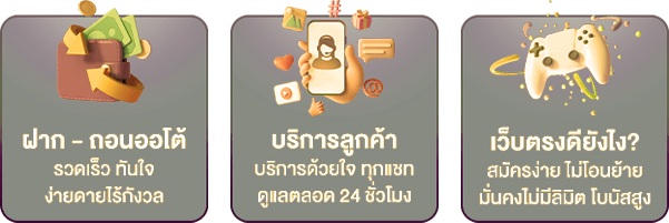 ตอบ : - มีระบบความปลอดภัยมาตรฐานสากล รองรับการเล่นผ่านมือถือ ให้โบนัสแรกเข้า 100% และมีทีมซัพพอร์ตตลอด 24 ชั่วโมง